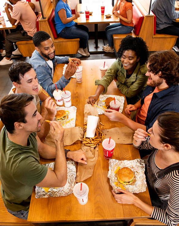 芝士汉堡配蛋黄酱、番茄、烤洋葱、墨西哥辣椒和番茄酱、薯条、Reese’s 杯奶昔