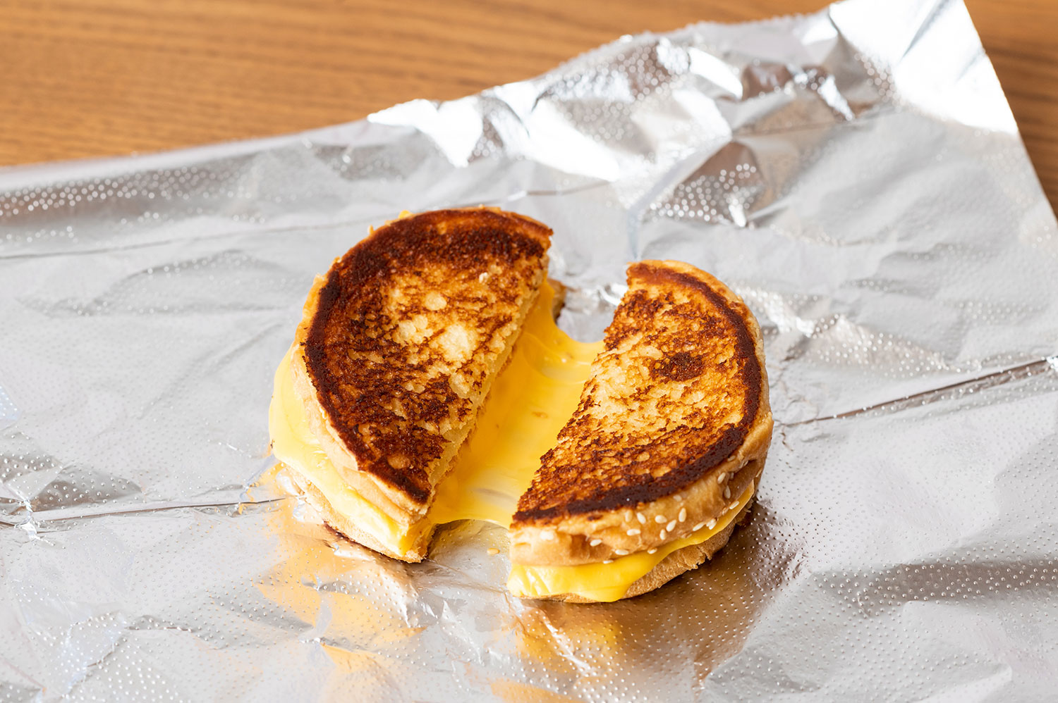 兩片美式芝士在翻轉的芝麻麵包上融化,配搭您選擇的配料並烤至金黃色。